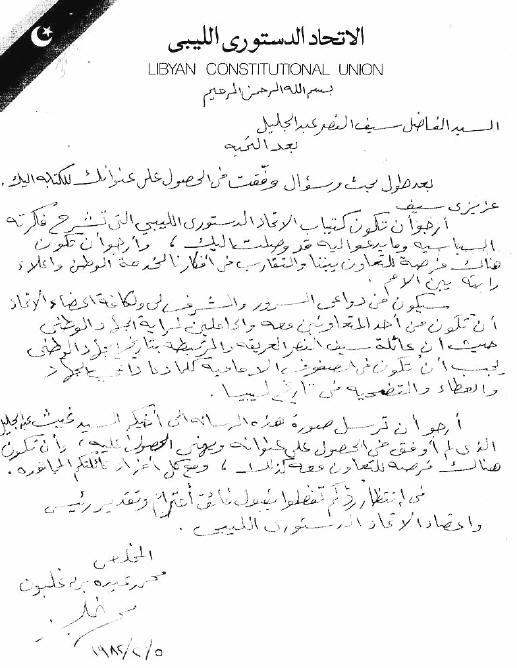الاتحاد الدستوري الليبي، والذى ترجمه فى إفصاح صريح لاستعداده بمؤازرة